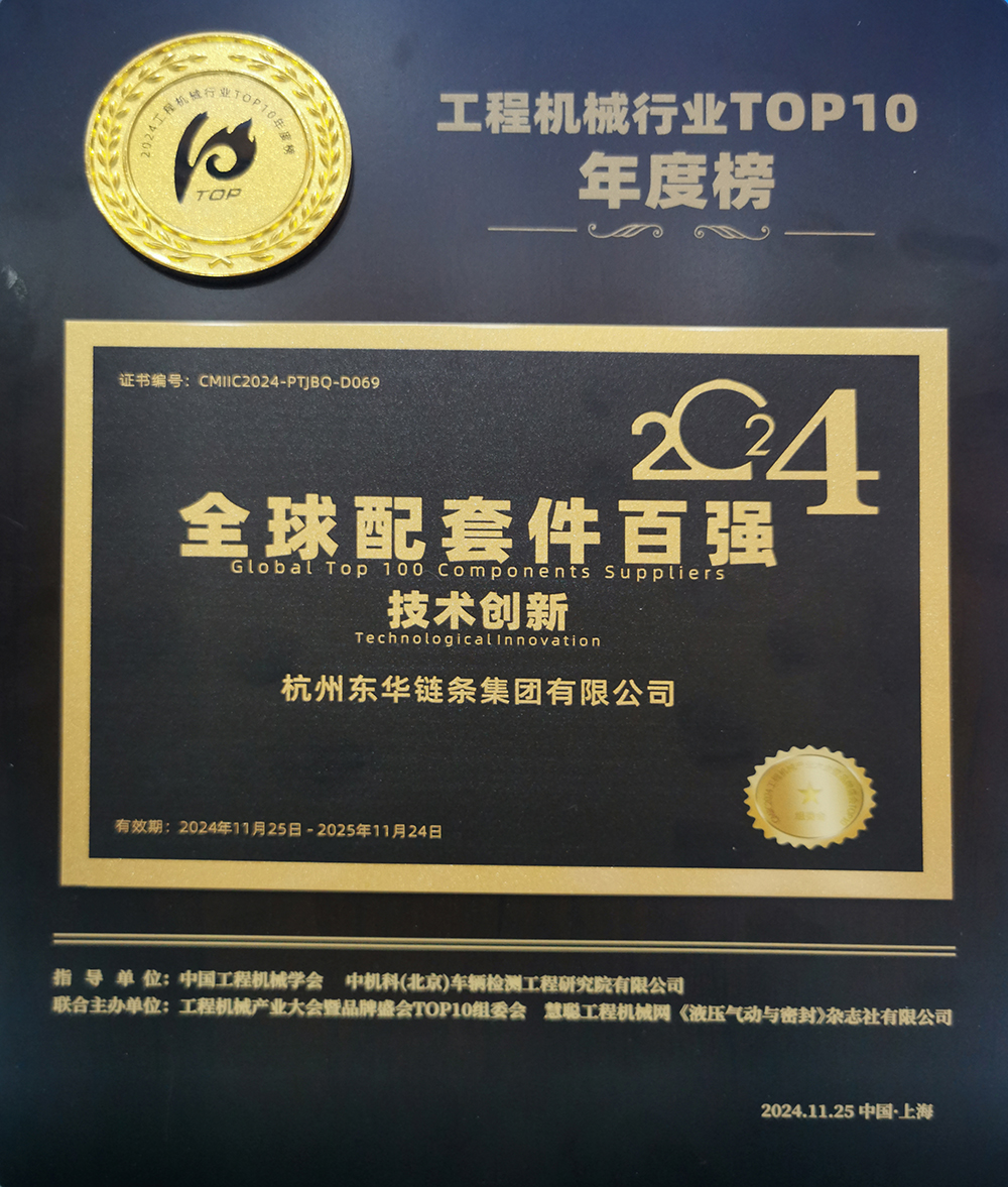 會(huì)上,東華獲評(píng)“2024工程機(jī)械行業(yè)TOP10全球配套件百?gòu)?qiáng)技術(shù)創(chuàng)新”獎(jiǎng)。東華鏈條集團(tuán)副總經(jīng)理?xiàng)钚∮麓砥髽I(yè)參加會(huì)議并上臺(tái)領(lǐng)獎(jiǎng)。